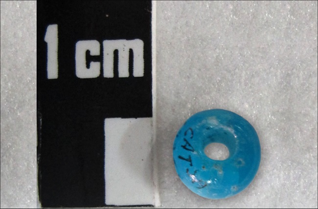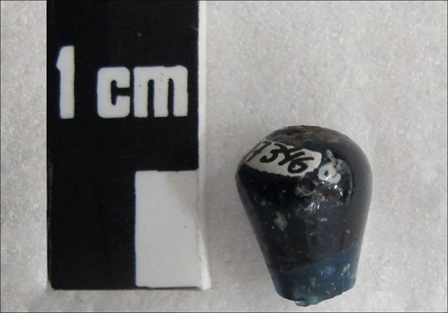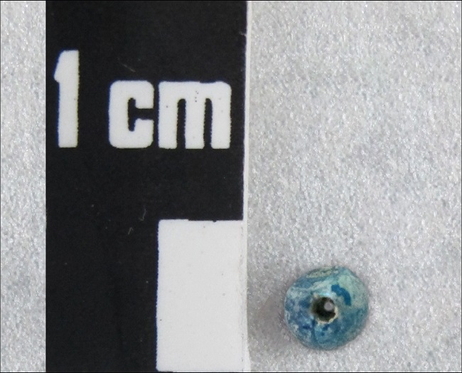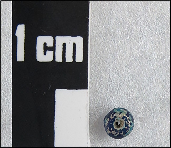O outro grupo de contas mais ou menos uniforme consiste em um conjunto de quatro exemplares pequenos e com bastantes sinais de desgaste e decomposição. A sua forma varia entre globuloide de tom azul cobalto44 ou ovoidal de tom azul cobalto45 e azul turquesa46 (Figuras 23 e 24, respectivamente). Estruturados pela sobreposição sucessiva de camadas de vidro, que atualmente apresentam uma coloração opaca devido às condições de jazida, eles têm semelhanças com o tipo Nueva Cadiz encontrado em contextos americanos e que frequentemente são considerados importações italianas (Stemm et al., 2013). Tais suposições baseiam-se no fato de esta técnica ter surgido pela primeira vez em Veneza e Murano, mas, ao longo do período moderno, ela expandiu-se por toda a Europa, nomeadamente por Barcelona (Catalunha), Amesterdã (Países Baixos) e Hammersmith (Inglaterra). Por isso, não se pode descartar que o fluxo permanente de vidreiros destas regiões na Nova Espanha não tenha suscitado uma produção interna (Gasparetto, 1958; Van Dillen, 1933; Karklins et al., 2015).