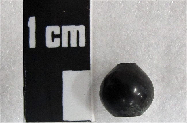 Nesta zona, foram ainda detectadas duas contas modeladas, de forma globular: uma de cor azul-escuro, quase negro (Figura 25)47, e outra negra (Figura 26)48, ambas de vidro opaco, mas também uma peça em forma de pingente (Figura 27)49. As duas últimas aparecem referidas como exemplares dos séculos XVI-XVII na ficha de sítio, mas não se sabe em que elementos se baseou o arqueólogo para definir tal cronologia.