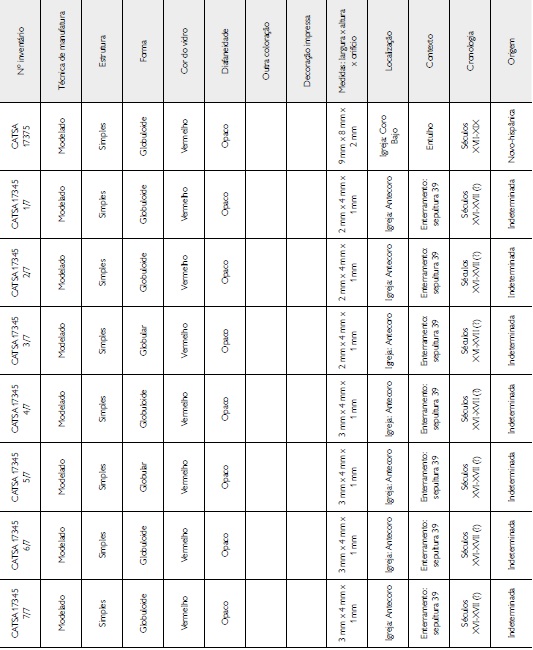 A escavação da igreja abrangeu as zonas do corpo propriamente dito, onde circulava a população civil que assistia aí à missa. Era à vista de todos que se encontravam diferentes estátuas religiosas sobre as quais se colocavam finos tecidos bordados e joias, que poderiam incluir contas de vidro24. Ainda assim, ela contava com espaços mais reservados, como a sacristia, o coro e o antecoro ou sala de profundis (pagaduría). Detectaram-se igualmente sete criptas na nave principal do templo com enterramentos e localizou-se o antigo presbitério da igreja inicial. Associadas a estes contextos, apareceram algumas contas de vidro.