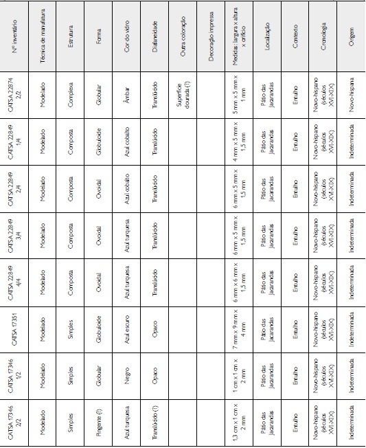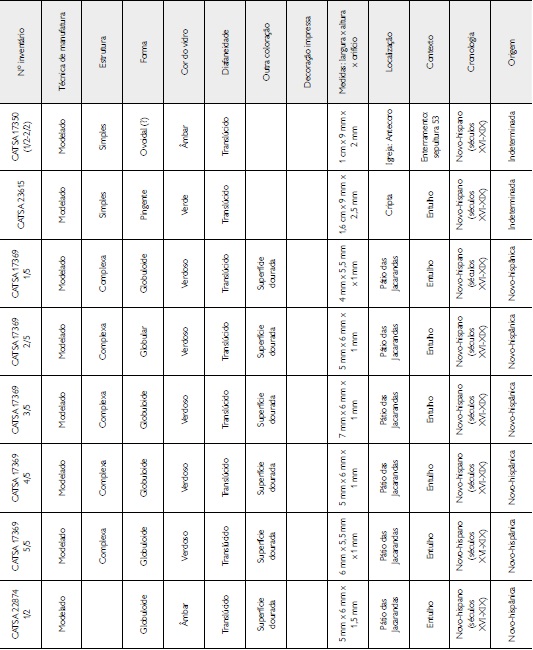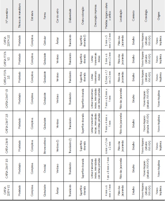 No que concerne especificamente às contas de vidro, analisaram-se os 32 exemplares que compõem a coleção custodiada pelo depósito do departamento de Salvamento Arqueológico do INAH, na Cidade do México. Para o efeito, adotaram-se os critérios estabelecidos por DeCorse et al. (2003) para a classificação de contas de vidro. Desse modo, descreveram-se, de forma genérica, os aspectos relacionados com a técnica de produção, a forma, a estrutura23, a cor e o tipo de decoração impressa, identificando a cronologia e o local de produção (Apêndice). Ainda assim, optou-se por apresentar a imagem de pelo menos um exemplar de cada tipo de conta, mas sem realizar um estudo acerca da composição do vidro. Tal escolha deve-se ao fato de ter sido comum reciclar este material ou importar ingredientes para utilizar nas fórmulas locais, o que poderia levar a interpretações equívocas acerca do local de produção dessas peças (Departamento del Fomento General y de la Balanza de Comercio de España, 1805).