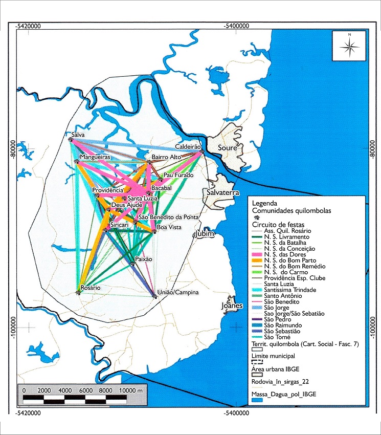 Ao analisarmos os circuitos de festas intra e entre as comunidades quilombolas de Salvaterra, evidenciamos um dos nexos responsáveis pela tessitura das relações entre os vários grupos sociais. As festas de santo são elementos significativos, que criam fortes laços coletivos pelo conjunto de relações de reciprocidade criadas, reforçadas e atualizadas nestes momentos festivos, constituindo-se, assim, em fortes alianças políticas. Elas e a própria imagem do santo padroeiro construíram cada comunidade como uma unidade política, simbólica e territorial e já vinham propiciando a partilha dos territórios ao longo de décadas, criando, ao mesmo tempo, um território específico de cada comunidade e um mais amplo, envolvendo o conjunto destas comunidades.