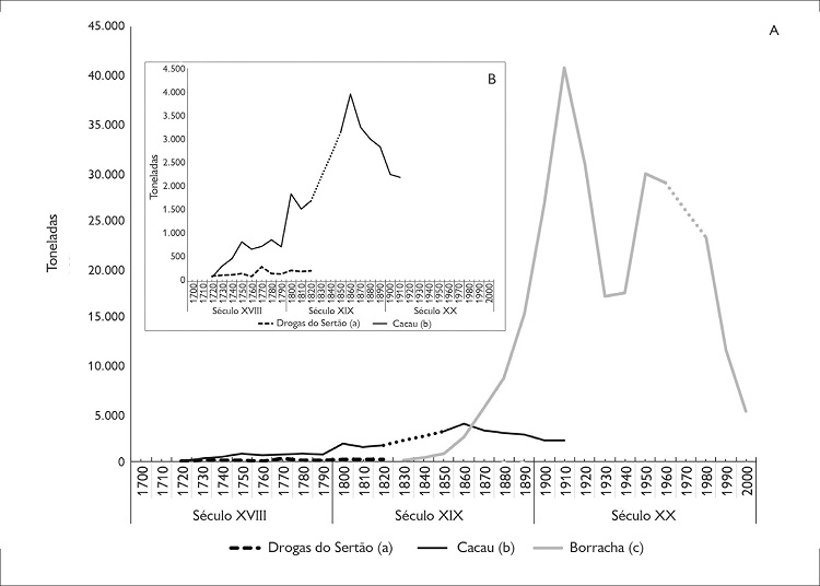 As principais atividades econômicas extrativistas discutidas são a coleta de drogas do sertão, a extração de cacau, a exploração de tartarugas e a extração de látex para a produção de borracha. Reconheço que, restringindo este ensaio a tais produtos, deixamos de abordar outras atividades extrativas que tiveram alguma importância para a economia regional. A Figura 1 demostra o período de início, de evolução e de declínio das referidas atividades extrativistas a partir do século XVIII até o século XX1.