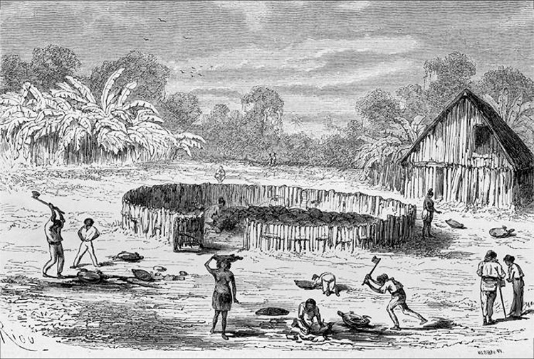 (Ferreira, 1972, p. 27).A dieta alimentar de populações ribeirinhas era fortemente concentrada em recursos aquáticos, incluindo a carne de tartaruga, também apreciada na dieta dos próprios viajantes e de seus acompanhantes. Brown e Lidstone, viajando pela região em 1873, fizeram descrições sobre a captura dos animais para a sua tripulação e narraram como eram estocadas em currais, após a captura por ribeirinhos dos tributários do rio Amazonas. A ilustração de Marcoy (Figura 2), um naturalista francês que veio para a Amazônia na mesma época, retrata tais descrições:
