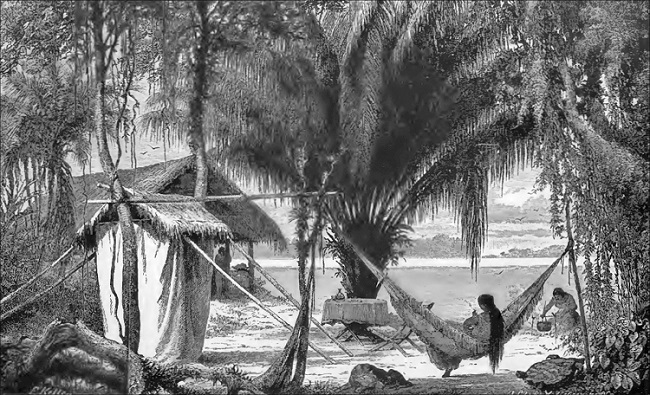 (Brown; Lidstone, 1878, p. 459-460, tradução nossa).Keller[-Leuzinger] (1874), contratado pelo governo brasileiro, que viajou pelo rio Madeira, em 1867, com o objetivo de projetar a estrada de ferro ferrovia Madeira-Mamoré, relatou e ilustrou (Figura 3) a crescente ocupação das margens do rio Madeira por empreendedores e migrantes nordestinos à procura de novas áreas para a produção de borracha: