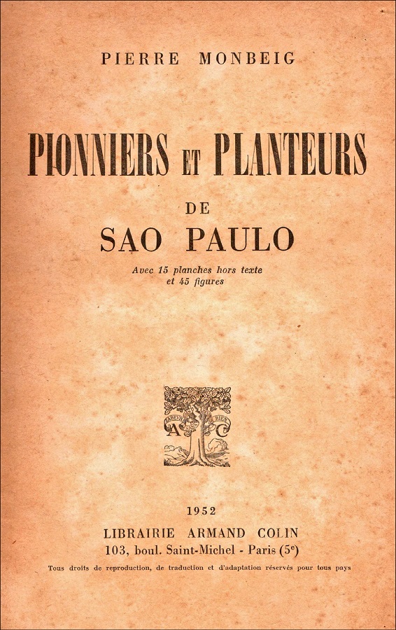 Este vínculo profícuo com o país que lhe deu oportunidade, segundo o próprio Monbeig, de se aventurar quando jovem em uma verdadeira ‘viagem de exploração’, pode ser verificado em seus livros e artigos, cujos temas principais foram o Brasil e os problemas brasileiros, como “Ensaios de geografia humana brasileira” (Monbeig, 1940), “Brasil” (Monbeig, 1969), “Pioneiros e fazendeiros de São Paulo” (Monbeig, 1984b) e “O crescimento da cidade de São Paulo” (Monbeig, 2004), além de textos publicados na imprensa, principalmente no jornal “O Estado de São Paulo”3. Ao mesmo tempo, Monbeig ajudou na consolidação da Associação dos Geógrafos Brasileiros (AGB), ao lado de Caio Prado Júnior e Pierre Deffontaines, sendo um colaborador contumaz das publicações desta organização4.