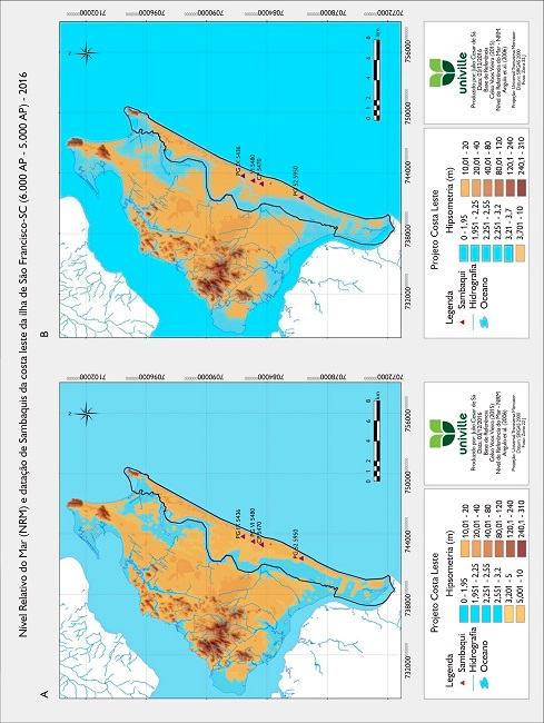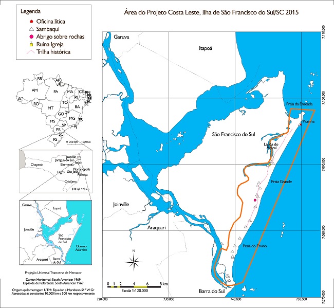 Buscando, portanto, propor um modelo interpretativo sobre a identidade destes grupos, o modo como eles se instalaram na região e as relações que estabeleceram entre si e com o ambiente, está em andamento o projeto “Cultura material e patrimônio arqueológico pré-colonial da costa leste da ilha de São Francisco do Sul – SC – contribuição para uma arqueologia da paisagem costeira e estudos de etnicidade (costa leste)”1, sob coordenação de Dione R. Bandeira, o qual compreende 30 km desta costa e vem realizando sondagens em um conjunto de 32 sambaquis, localizados em ambientes de dunas e antedunas, com vegetação de restinga, relevo ondulado e solo extremamente arenoso, bem como em floresta entremeada por banhados e bordas de manguezal.