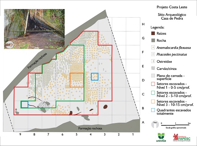 Visando aproveitar o máximo de informações possíveis durante as escavações do sítio Casa de Pedra, visto a sua peculiaridade e por estar sendo totalmente decapado, durante estes três anos já foram rebaixados 15 cm de profundidade. O sítio apresentou fragmentos ósseos humanos dispersos e queimados desde a superfície do sambaqui, juntamente com presença abundante de carvão. No entanto, não houve presença de sepultamento. Apresentou também composição abundante de fragmentos ósseos de ictiofauna, quelas de crustáceos e material conquiológico, no qual predominam os moluscos bivalves berbigão (Anomalocardia flexuosa), lambreta (Phacoides pectinatus) e ostras (representantes da família Ostreidae). Estas espécies não estão igualmente distribuídas na extensão do sítio, variando em diversidade, conforme a sua localização na matriz arqueológica.