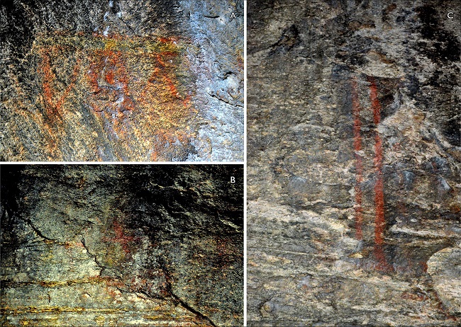 Outro aspecto que tornou este sítio peculiar foi a presença de pinturas rupestres nas paredes interiores do afloramento rochoso, feitas com algum corante de tonalidade vermelha, registradas durante as intervenções arqueológicas no sítio (Figuras 4A a 4C). No entanto, não vamos nos ocupar aqui deste tema, devido à insuficiência de dados. Há um projeto específico já em andamento sobre este assunto.