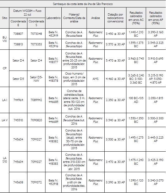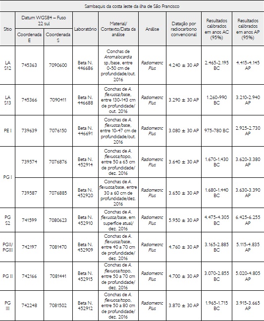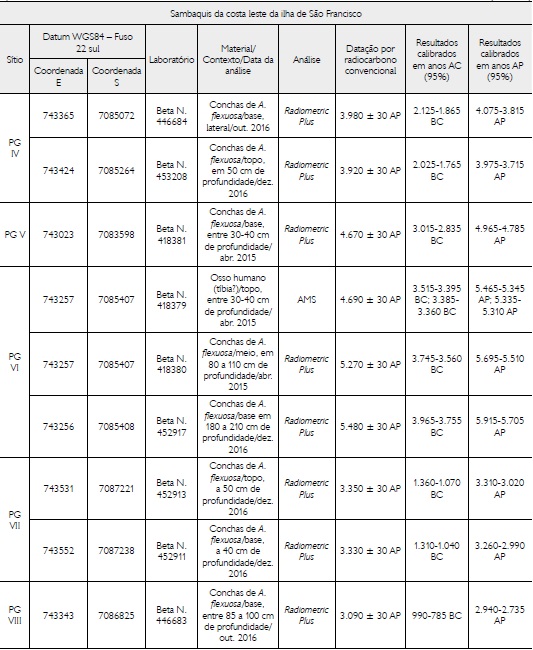 Para as datações de radiocarbono convencionais, foram selecionados um fragmento ósseo da mão de um humano, encontrado na superfície do sítio por volta de 3 cm de profundidade, e material conquiológico, presente a 25 cm abaixo da superfície, resultando, respectivamente, em 4.460 ± 30 e 5.470 ± 30 anos AP. Porém, sedimentos coletados a 20 cm (amostra 4551) e a 50 cm (amostra 4552) abaixo da base do sambaqui foram datados, respectivamente, em 4.330 ± 700 e 5.670 ± 850 anos AP.