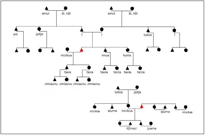 In ego’s generation there are distinctions based on ego’s sex, but in the ascending and descending generations there are no such distinctions. In the ascending generation, we see that *tutɨɾa and *jai tʃe are polysemous with parents’ opposite-sex siblings, suggesting a pattern of cross-cousin marriage. Recall, however, that terms for these in the first descending generation do not instantiate a parallel-cross distinction. Nor is such a distinction instantiated in affinal terms in the first descending generation: the terms for ‘son-in-law’ and ‘daughter-in-law’ show no similarities with ‘nephew’ and ‘niece,’ respectively, as might be expected given the polysemy in the first ascending generation. Finally, as in the consanguineal domain, opposite-sex in-law terms in ego’s generation are derived from the corresponding spousal terms via the insertion of ɨ.
