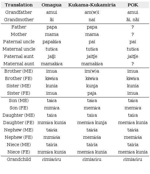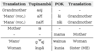 The term for paternal uncle, *pai, despite its resemblance to Portuguese, appearss to be cognate with Tupinambá paɁi, a vocative term for father ( Barbosa, 1951, p. 119). We have seen that Tupinambá uβ could refer to a father and to a paternal uncle, making it likely that paɁi was used as a vocative for the same individuals. In this case, this form came not only to be referential in POK, but also survives only in its reference to a paternal uncle. That is, the equation of a father with a father’s brother was split, perhaps under the influence of the borrowing for father. Related to this is the loss of the term for maternal aunt. Both Omagua and Kukama-Kukamiria have mamakɨɾa, but this form is based on an almost certain borrowing. Given that the enclitic *= kɨɾa was a diminutive in POK (see above), whatever the form is that preceded mamakɨɾa, it was likely based on a similarly morphologically complex term for mother, as in Tupinambá, such that the innovation of mamakɨɾa is a calque. Omagua subsequently replaced paternal uncle with papakɨɾa by analogy.