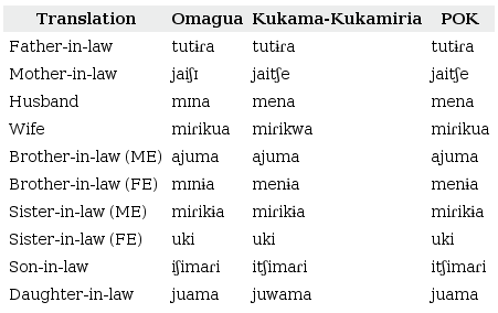 In the first ascending generation, terms for maternal uncle and paternal aunt ( Table 1) were extended to refer to parents-in-law. In ego’s generation, terms based on the spousal equivalents were derived via ɨ to refer to opposite-sex in-laws, that is, the brothers-in-law of women and the sisters-in-law of men. For same-sex in-laws, two processes are attested. For female egos, the TG form was simply retained (* uki); for male egos, the TG form was replaced by * ajuma, of unknown origin. And in the first descending generation, the resulting non-ego-based distinction is similarly expressed via two borrowings of unknown origin.