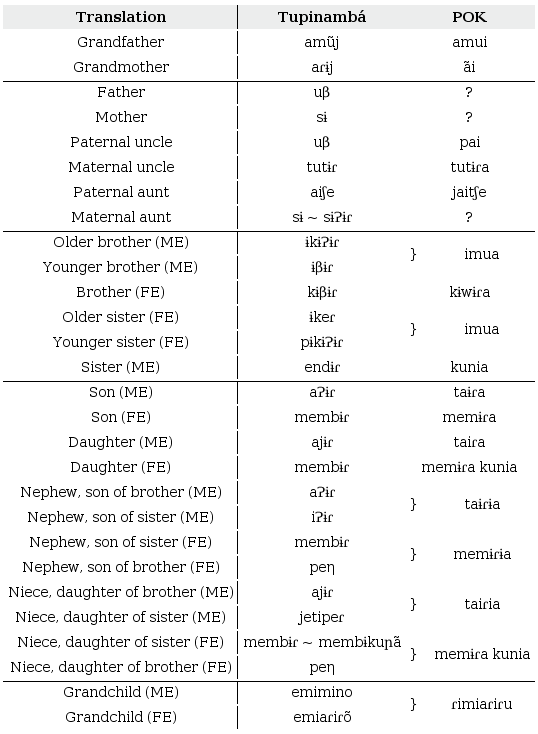 In this section I compare the forms reconstructed in POK and their organizational structures with those of Tupinambá, the closest relative of POK ( Michael et al., 2015, p. 205). It is important to note that the structure of the Tupinambá kinship system is consonant with those of many TG languages, and can uncontroversially be assumed to have held for the common ancestor of Tupinambá and POK. With this in mind I will speak of changes between the Tupinambá and POK systems, although the two languages are sisters (strictly speaking) and not direct descendants of one another. We will see significant change in both structure and forms, which resulted from the intense language contact experienced by speakers of pre-POK. In general, the POK system is a simplification of the Tupinambá system, in the sense that fewer sorts of kin relations are distinguished by unique lexical items.