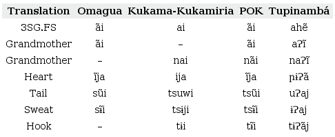 There is reason to believe that the relevant generalization might be that nasal vowels survived in POK if in the ancestral language they were the nucleus of a syllable that began with a glottal consonant (in all cases but one, the glottal stop): cognates of *tsɨi ‘tail’ in at least three TG languages exhibit the nasal diphthong ãj; cognates of *tsɨi ‘sweat’ do not exhibit a nasal diphthong, but the diphthong may have nasalized in the ancestor of POK by analogy with forms of similar phonological shape. There are exceedingly few forms in Tupinambá that contain syllables of the shape Ɂν(G), and even fewer that were inherited into POK; however, all forms with this syllable shape follow this pattern.