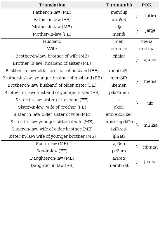 In terms of form, in this domain Tupinambá exhibits 14 compound forms involving two kin terms, out of a total of 20. Non-compound are aiʃo, men, emiɾeko, oβajaɾ, ukeɁi, and peɁum, which span all three generations. The compound terms are always transparent, e.g., menduβ, a combination of men ‘husband’ and uβ ‘father.’ Sometimes they attest to archaic forms, e.g., atuɁuβ, based on atɨ. In POK there are three borrowings, two internal derivations with ɨ, and semantic shifts that crosscut these two phenomena. Only *mena ‘husband’ and *miɾikua ‘wife’ were inherited with the same meaning.