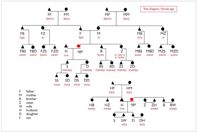 The nomenclature is presented below in Table 1, 3 and tree diagrams to ego are presented in Figures 1 and 2. All kin terms can be used as both reference terms and terms of address. Affinal terms are generally not used as terms of address, owing to the influence of affinal avoidance.