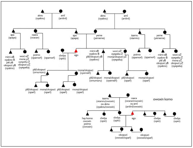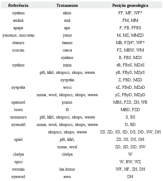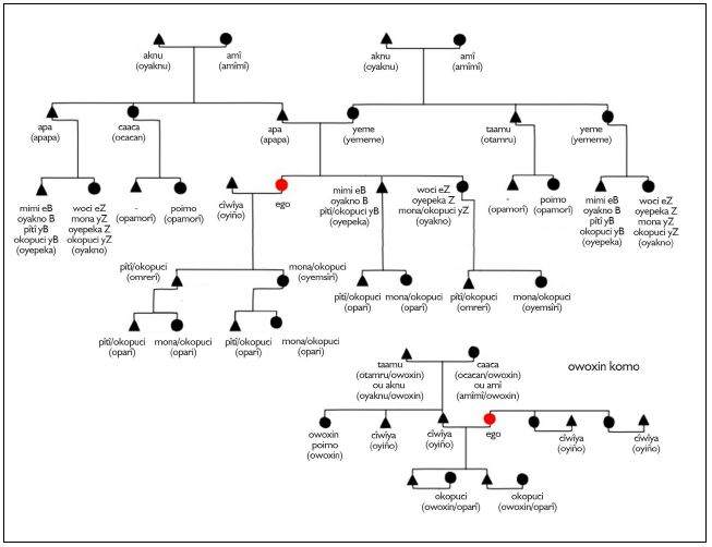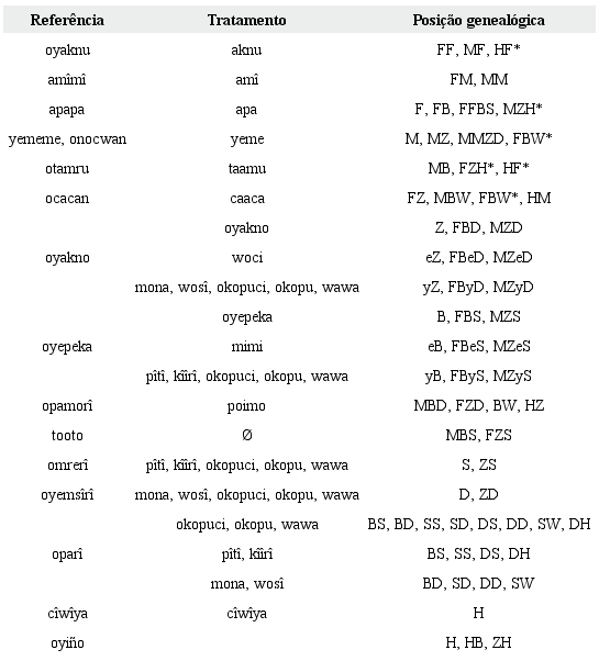 Quando duas pessoas não relacionadas genealogicamente como primas cruzadas se casam, o sogro poderá ou não ser reclassificado como ‘irmão da mãe/tio’, taamu. Muitas vezes, o termo preferido será ‘avô’, aknu, aplicável virtualmente a qualquer idoso do sexo masculino. A reclassificação é sempre individual e depende da história específica do relacionamento entre as duas pessoas envolvidas 14. Foi observado um caso em que marido e mulher se tratavam previamente como germanos por dois motivos: foram criados juntos como epeka komo, ‘irmãos’, e seus pais eram germanos classificatórios. Após o pai genealógico da mulher abandonar a família, ela e uma irmã consanguínea foram criadas como ‘filhas’, emsîrî komo, pelo germano classificatório do pai, a quem tratavam, portanto, como apa 15. Os filhos do pai, junto aos quais cresceram, eram classificados por elas como ‘meus irmãos’, oyepeka komo, e as filhas como ‘minhas irmãs’, oyakno komo. Com a união matrimonial, o pai do marido deixou de ser apa, e passou à posição de avô, aknu. Os irmãos do marido foram reclassificados como oyiño yakno komo, ‘irmãos de meu marido’, ou oyiño komo, ‘meus maridos’, e as irmãs do marido como oyiño yepeka komo, ‘irmãs de meu marido’, ou ainda como owoxin komo, ‘minhas cunhadas’. A reclassificação não foi realizada, contudo, por sua irmã consanguínea criada no mesmo contexto. Ela continua tratando essas pessoas como parentes consanguíneos, e não como afins, e sendo tratada por elas também como consanguínea. Em todos os casos, as classificações de parentesco são individuais e dependem do histórico de relações entre os envolvidos.
