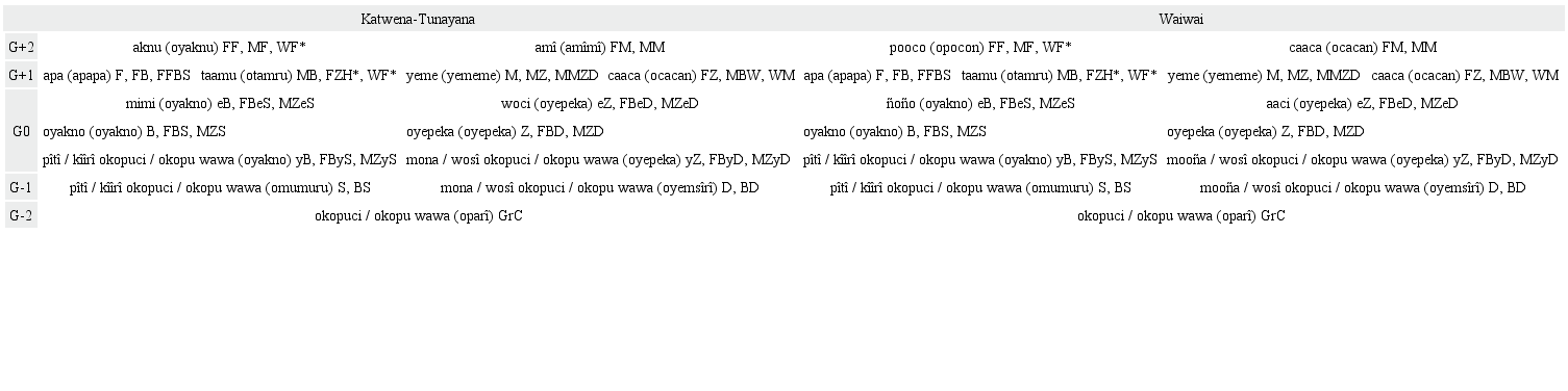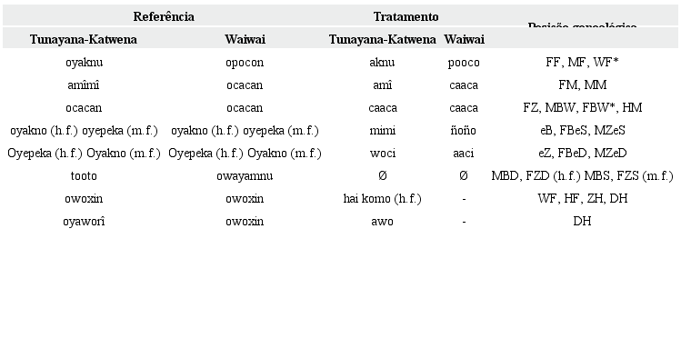 No Quadro 5, o asterisco foi utilizado nos casos em que a terminologia katwena-tunayana difere da terminologia waiwai. Na língua waiwai, o termo equivalente para irmão mais velho é ñoño, e para irmã mais velha é aaci. E o termo katwena-tunayana mona, ‘vagina’, em waiwai, é ligeiramente diferente, mooña. Os termos de referência oyakno e oyepeka expressam simetria entre as posições relativas de ego e alter, evitando a distinção hierárquica entre pessoas de mesma geração. Oyakno pode ser usado como tratamento recíproco por germanos classificatórios de mesmo sexo. Esses termos são idênticos nas duas línguas. A esses dois termos de referência, oyakno e oyepeka, correspondem oito vocativos com distinção etária. Os vocativos para irmão mais velho e irmã mais velha, por seu conteúdo assimétrico, podem ser empregados como forma respeitosa de tratamento para pessoas não aparentadas em geral, mesmo as mais novas do que ego. Os vocativos para germanos mais novos são idênticos nas duas línguas, e são utilizados para os outros parentes das gerações descendentes: Pîtî, ‘pênis’, e kîîrî, ‘macho/homem’, designam o irmão mais novo e o filho. Okopuci, okopu e wawa designam, além do irmão mais novo e do filho, o sobrinho e o neto. Mona, ‘vagina’, e wosî, ‘fêmea/mulher’, designam a irmã mais nova e a filha. Okopuci, okopu e wawa designam, além da irmã mais nova e da filha, a sobrinha e a neta. Hoje em dia, os termos ‘pênis’ e ‘vagina’ têm sido menos utilizados do que kîîrî, ‘macho/homem’, e wosî, ‘fêmea/mulher’. O uso de pîtî e de mona pelos Katwena e Tunayana é tomado como um marcador de sua diferença étnica pelos Waiwai do Mapuera, que argumentam não utilizar esses termos no contexto do parentesco, embora utilizem para identificar o pênis e a vagina propriamente ditos 18.
