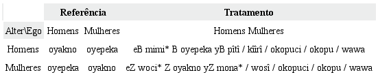 O Quadro 6 organiza as observações até aqui descritas, deixando mais claras as equivalências intergeracionais características do parentesco katwena-tunayana e do parentesco waiwai, bem como as diferenças entre a terminologia de referência e a terminologia de tratamento. Os termos marcados com asterisco são classificações possíveis não resolvidas a priori. Inspirados em uma tabela elaborada por Howard (2001, p. 106) para a terminologia waiwai, apresentamos primeiramente os termos de tratamento, seguidos dos termos de referência entre parêntesis.