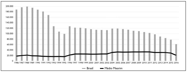 Em termos de valor da produção, até 2011, o babaçu era considerado o segundo produto florestal não madeireiro no país, após o açaí, alcançando naquele ano R$ 142 milhões ( IBGE, 2016). A partir de 2012, o valor gerado por outros produtos (castanha-do-pará, erva-mate e carnaúba) passa a superar o do babaçu. Já em termos da quantidade produzida, a série histórica do Instituto Brasileiro de Geografia e Estatística (IBGE) indica tendência de queda progressiva a partir do final da década de 1980. A produção de amêndoas de babaçu, que se aproximava de 200 mil toneladas anuais, resumiu-se a 60 mil toneladas em 2016. Na microrregião do Médio Mearim, contudo, a produção apresentou significativo incremento no mesmo período. No final dos anos 80, sua produção anual era de cerca 20 mil toneladas, passando a mais de 30 mil toneladas entre 2004 e 2014, com queda observada apenas em 2015 e 2016 ( Figura 1).