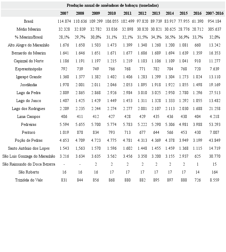 Decorridos doze anos desde o censo agropecuário realizado em 2006, aguarda-se, para 2018, a publicação de estatísticas atualizadas. O último censo indicava uma produção de 54 mil toneladas de amêndoas na microrregião do Médio Mearim, gerando um valor de cerca de R$ 36 milhões. Dados mais recentes do IBGE, incluídos na Produção da Extração Vegetal e Silvicultura (PEVS), indicam que, nos 18 municípios do Médio Mearim considerados neste estudo, a produção de amêndoas alcançou, em 2016, cerca de 20 mil toneladas, e um valor de R$ 33 milhões. Vale lembrar, contudo, que os dados da PEVS são estimativas obtidas junto a informantes vinculados às respectivas cadeias produtivas. Apesar do conhecimento acumulado destes informantes, as estimativas não captam especificidades da localização da produção. Em muitas situações, a informação que chega aos órgãos públicos e agentes da cadeia produtiva refere-se ao local de comercialização, e não de produção efetiva. Por essa razão, a produção tende a ser superestimada em municípios com estabelecimentos comerciais de maior porte, para onde é inicialmente canalizada a produção local, em operações, via de regra, com pouca formalidade em seu registro.