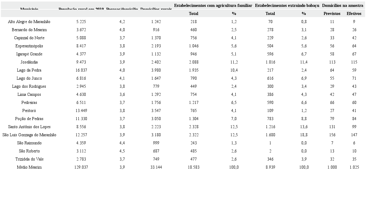Os dados analisados neste estudo foram coletados a partir de um diagnóstico socioeconômico, cujo questionário estruturado foi aplicado a 1.025 domicílios, localizados em 18 municípios do Médio Mearim. Para a estratificação da amostra, considerou-se, a partir dos dados do censo agropecuário de 2006, a proporcionalidade, em cada município, dos números de estabelecimentos da agricultura familiar e de estabelecimentos nos quais ocorria o extrativismo do babaçu. Através da utilização destas duas variáveis, às quais foram atribuídos pesos iguais, estabeleceu-se a quantidade prevista de domicílios a serem entrevistados por município, sendo realizados pequenos ajustes na composição final, conforme apresentado na Tabela 2.