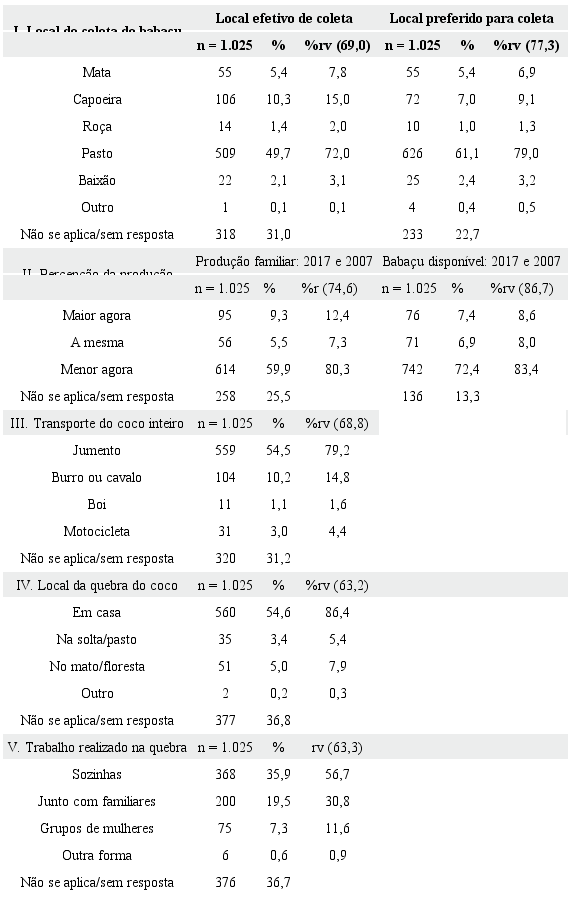 Resultados da sistematização dos diagnósticos são apresentados nas Tabelas 3 a 7. A Tabela 3 resume aspectos do extrativismo do babaçu no Médio Mearim. Inicialmente, constata-se que pouco mais de dois terços dos entrevistados (69%) responderam ter coletado babaçu nos 12 meses anteriores à entrevista.