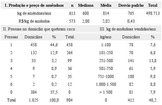 A Tabela 4 inicialmente apresenta as estatísticas da comercialização anual de amêndoas nos domicílios pesquisados. Verifica-se que pouco mais de 60% dos domicílios comercializaram amêndoas no ano anterior à pesquisa, para um volume total de cerca de 490 toneladas, vendidas ao valor médio de R$ 2,02/kg 2. No item II da Tabela 4, verifica-se que 904 pessoas atuaram no extrativismo do babaçu nos 1.025 domicílios entrevistados. A Tabela 4 apresenta, no item III, a distribuição dos domicílios em sete classes, conforme a quantidade anual de amêndoas comercializadas, verificando-se maior frequência daqueles que comercializam entre 250 a 500 kg/ano.