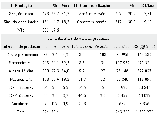 Para estimar o volume anual de carvão produzido nos domicílios pesquisados, utilizamos a periodicidade entre episódios de sua fabricação e a quantidade média produzida por episódio. Dois terços das famílias que produzem carvão o fazem semanalmente ou a cada duas semanas, com proporções progressivamente menores para maiores intervalos. Já a quantidade média produzida em cada episódio de fabricação cresce à medida em que aumenta o intervalo. Esta produção é usualmente informada em latas (de 18 litros), que equivalem a 5 kg do produto. Através desta estratificação, podemos obter uma estimativa mais confiável para o volume anual de carvão produzido pelas famílias entrevistadas, que supera 260 mil latas, ou 1.300 toneladas.