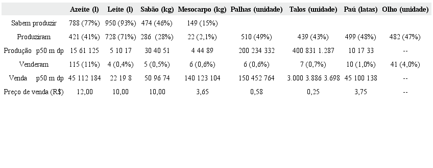 Entre os quatro produtos, destaca-se o índice dos que sabem produzir leite do babaçu (93% dos domicílios), que também apresentou o maior percentual de famílias que declararam essa produção (71% dos domicílios). Todos os produtos são utilizados, sobretudo pelo domicílio, com baixa taxa de comercialização. A Tabela 6 apresenta as quantidades produzidas e vendidas destes itens, bem como os seus preços de venda.