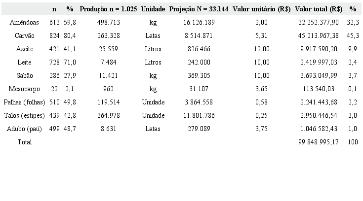 Os resultados de campo confirmam a relevância do consumo e do uso dos produtos derivados do babaçu pelas famílias extrativistas. Considerando projeções para os 18 municípios do Médio Mearim, a valoração monetária de toda a produção de derivados de babaçu gerada nessas localidades superaria R$ 99 milhões, valor muito superior ao atribuído apenas para as amêndoas nas estatísticas oficiais. A importância desta renda originada pelo babaçu às famílias do Médio Mearim corresponde a um valor médio anual de R$ 3.012,58, que seria atribuído a cada domicílio rural da microrregião, a partir da valoração monetária da totalidade de itens produzidos, sendo que o produto da comercialização de amêndoas representaria apenas um terço desse montante 4.