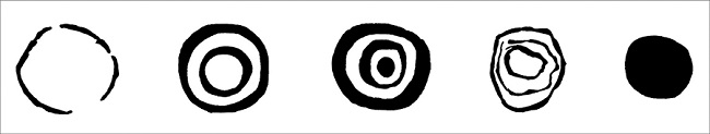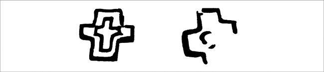 Os motivos geométricos apresentam uma diversidade de formas, no entanto, há pelo menos três temas recorrentes: os círculos, as cruzes e as volutas. Os círculos apresentam-se com diferentes variações de preenchimento (Figura 2), enquanto as volutas (Figura 3) aparecem na sua forma básica, espelhada ou constituindo a base para a elaboração de motivos com diferentes graus de complexidade. As cruzes aparecem representadas duas vezes, sendo uma concêntrica e a outra com um círculo no seu interior (Figura 4).