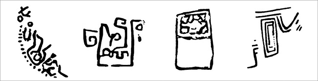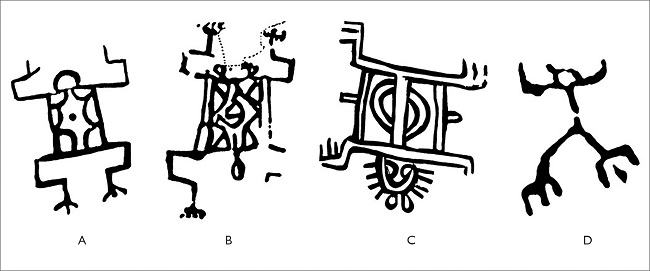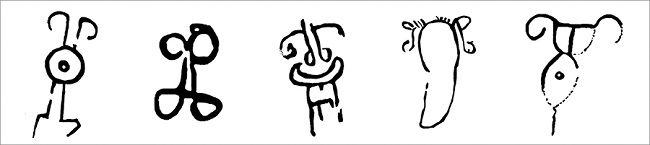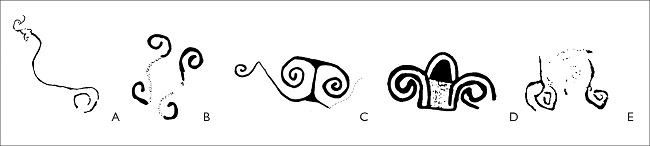 Além dos motivos recorrentes ora descritos, há também figuras cuja má conservação não permite identificar com clareza as formas e outras bem conservadas que permitem vê-las de forma completa. Estas últimas serão o foco desta análise. Considerando, portanto, este universo de análise e o fato de serem formas que não se repetem – o que constitui uma dificuldade em termos classificatórios –, centramos a análise não no motivo em si, mas na maneira como ele é estruturado. Assim, foi possível distinguir duas formas de representação gráfica: a) motivos diferentes entre si, mas que têm em comum, na sua estrutura, a simetria bilateral (Figura 5); b) motivos diferentes entre si e elaborados a partir de conjunto de linhas retas e pontos (Figura 6).