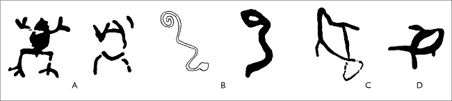 As figuras zoomorfas passíveis de reconhecimento são poucas (Figura 7). Foram identificadas representações de peixe, cobras, sapos e um peixe-boi.