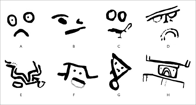 As representações de cabeça (Figura 9), identificadas na Caverna da Pedra Pintada, apresentam características comuns às pinturas de outros sítios da região, como as Figuras 9A, 9B e 9C, onde apenas os elementos faciais estão representados. Outras figuras apresentam traços que não encontram paralelo na anatomia humana, e que sugerem ser algum tipo de adorno facial (Figuras 9D e 9E). Três figuras apresentam diferentes contornos de cabeça (Figuras 9F, 9G e 9H) e, em todas elas, olhos e boca estão presentes. A Figura 9H destaca-se das demais por apresentar, na sua parte superior e inferior, duas linhas em cujas extremidades há dois traços verticais similares à forma de representação dos dedos da Figura 9C.