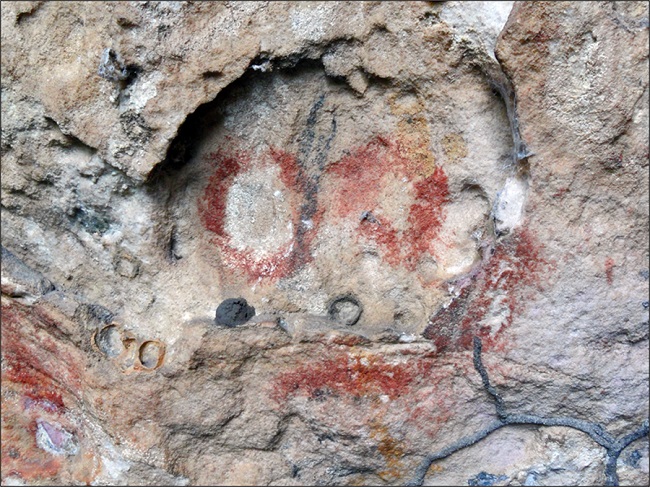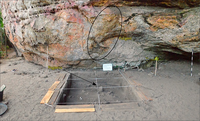 Na camada VIII, foi encontrada a maior das quatro fogueiras evidenciadas durante a escavação. Na parede acima do local, há uma grande mancha de fuligem sobrepondo alguns grafismos pintados (Figura 16). A data de carvões provenientes dessa fogueira é de 625 a 605 AP, portanto, as pinturas que estão abaixo da mancha de fuligem são anteriores a essa data.
