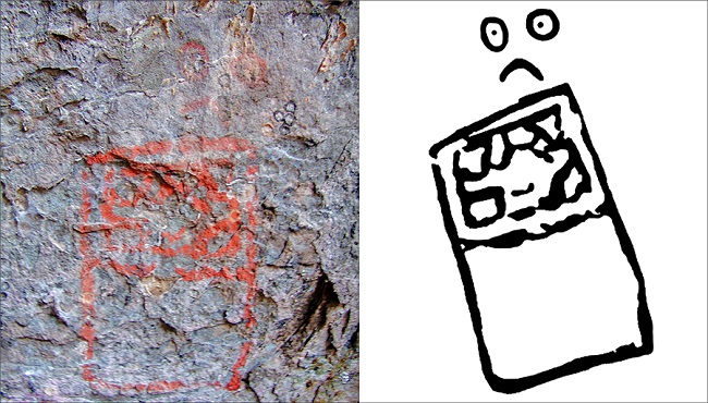 Ainda neste exemplo, observa-se diferença na intensidade da cor das pinturas. As figuras supostamente mais recentes têm a cor mais clara em relação à mais antiga. Essa diferença pode estar associada à forma de confecção do pigmento em diferentes momentos. Essa mesma situação ocorre em outras partes da gruta onde não há desplacamento, como as pinturas representadas na Figura 12. Nela, nota-se a diferença de cor entre dois motivos pintados, sendo o superior uma representação de rosto sem o contorno da cabeça e abaixo dela, uma figura geométrica.