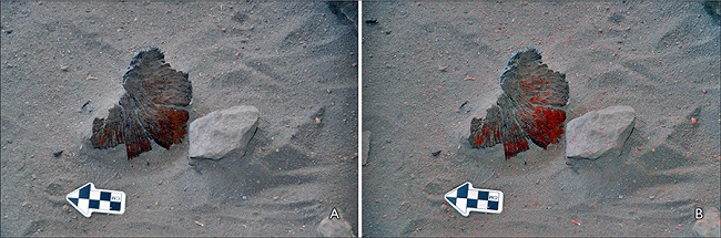 A análise formal das pinturas não nos permitiu reconhecer quais poderiam ser as mais antigas e as mais recentes. Procuramos, então, outras evidências que pudessem ajudar nos aspectos cronológicos. Uma delas é a existência de pinturas em uma área onde houve desplacamento da rocha. Tal situação é exemplificada na Figura 11, onde é possível ver, à esquerda, uma figura mais escura, parcialmente danificada pela queda do suporte, e no centro e à direita, duas figuras com tonalidade mais clara e que foram feitas após o desplacamento da rocha. Neste caso, há uma diferença temporal entre a figura da esquerda (mais escura) e as duas da direita (mais claras), onde a primeira seria a mais antiga e as outras, mais recentes. No entanto, ainda não é possível definir o tempo entre a execução destas figuras.