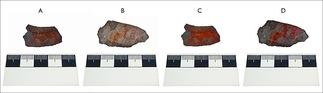 Na camada VII (nível D2), foram encontrados vários suportes com marca de uso de retirada de corante e, na quadra N-2254 E-5302, apareceu um grande fragmento de madeira carbonizada que preservou pigmento vermelho em uma de suas faces (Figura 13). A maior quantidade de materiais relacionados à produção de pigmentos é proveniente dessa camada, que foi datada entre 3.345 a 3.160 anos AP, sugerindo que, nesse período, a atividade gráfica rupestre pode ter sido mais intensa do que em períodos anteriores. A camada VII corresponde também ao período onde a produção cerâmica foi mais intensa (Quadro 2), o que corrobora a hipótese de Pereira (2010), de que parte das pinturas rupestres de Monte Alegre está associada a grupos ceramistas.