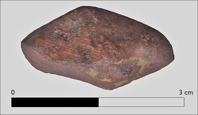 Essas duas variedades de cor estão presentes na arte rupestre de Monte Alegre e no próprio sítio, porém outros vestígios também aparecem pigmentados com as mesmas cores, como a cerâmica, um pedaço de madeira carbonizada (Figura 13) encontrado na escavação e algumas lascas associadas às indústrias líticas mais antigas da ocupação do sítio.