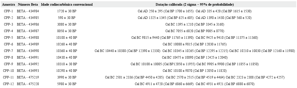 No entanto, apenas em meados dos anos 1990 foram obtidas as primeiras datações radiocarbônicas oriundas de uma escavação arqueológica realizada no sítio Caverna da Pedra Pintada1, em Monte Alegre, por Roosevelt et al. (1996). Um conjunto de datações revelou que a ocupação humana neste sítio se deu desde 11.200 anos AP e que se estendeu, de forma descontínua, até 430 anos AP.