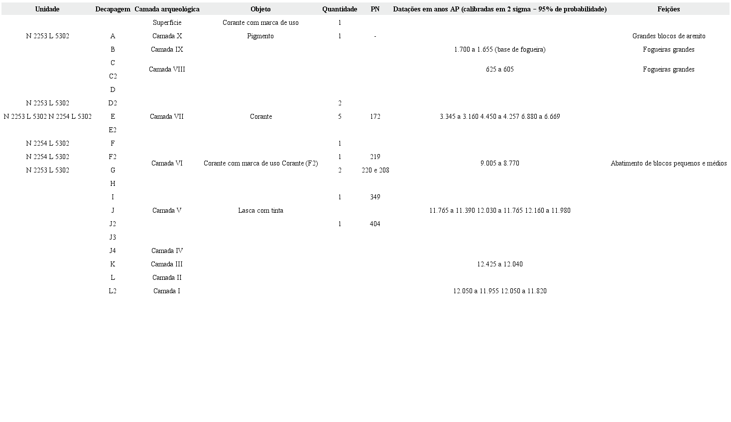 As evidências materiais relacionadas à prática gráfica rupestre (corantes e corante com marca de uso) continuam aparecendo nos níveis superiores da escavação. Na camada VI, datada entre 9.005 a 8.770 anos AP, foram encontrados três corantes, sendo que um deles apresenta marcas de uso (Figura 15).