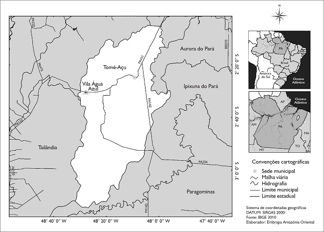 Metodologicamente, optamos pela realização de um estudo de caso, método que supõe o conhecimento do fenômeno a partir da exploração, em profundidade, de um único caso (Becker, 1999), aqui considerado um universo de 30 famílias, ou seja, a totalidade daquelas que cultivavam dendê na ocasião. A pesquisa foi realizada na vila Água Azul, em Tomé-Açu5, Pará (Figura 1). Esse município é emblemático em relação à produção de dendê, por ter sido palco do lançamento do Programa Federal de Produção Sustentável de Palma de Óleo (PSOP), pelo presidente Luís Inácio Lula da Silva (Lula), em 2010, e por ali estarem situados cultivos de duas empresas, produtores independentes e agricultores que têm contrato de integração. A escolha da vila Água Azul para a realização do estudo de caso decorre da existência de: i) agricultores integrados à dendeicultura, que já estavam produzindo o fruto, ii) assalariados nas agroindústrias de dendê e iii) monocultivos empresariais de dendê nos arredores da vila.