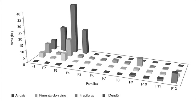 As maiores áreas cultivadas concentram-se nas quatro primeiras famílias e coincidem com aquelas que produzem dendê, pois dispor de área é uma das condições para ter acesso aos contratos. Não obstante, a maior diversidade e o maior equilíbrio entre os diferentes cultivos encontram-se nas últimas quatro famílias, caracterizadas como aquelas que não têm relação com a dendeicultura. As demais possuem as menores áreas e a menor variedade de cultivos.