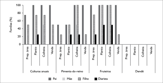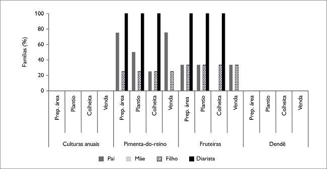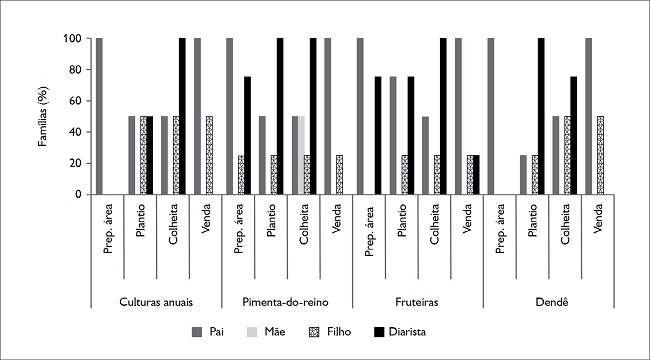 Como nos demais grupos, a comercialização é exclusividade dos homens, também os mais envolvidos nas atividades de produção. As mulheres, nessas famílias, atuam predominantemente na esfera doméstica e, ocasionalmente, na colheita de culturas anuais e de pimenta-do-reino e na despolpa de frutas. As mais jovens priorizam o estudo, mas, quando solicitadas, realizam as mesmas atividades anteriormente descritas. As mulheres entrevistadas consideram essas atividades como uma ‘ajuda’, que realizam somente em momentos de necessidade.