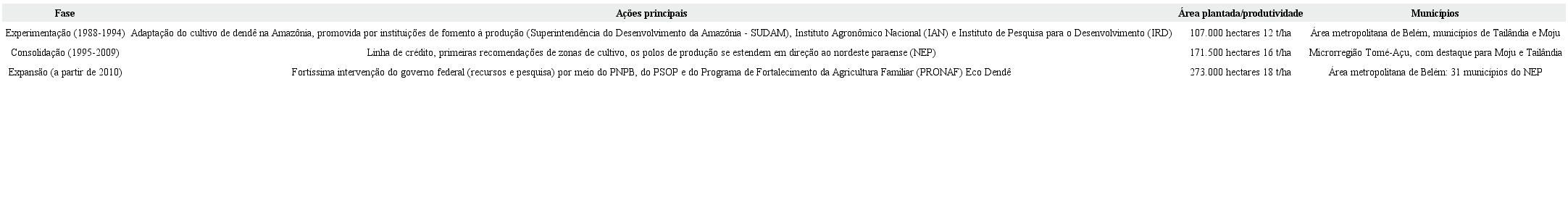 O registro da produção de dendê tem como referência principal o Instituto Brasileiro de Geografia e Estatística (IBGE), única fonte nacional que comporta uma série histórica de 27 anos (1988 a 2015), e permite visualizar a área plantada, a produção e os municípios envolvidos. Para fins analíticos, demarcamos três fases emblemáticas na expansão da dendeicultura no Pará (Quadro 1).