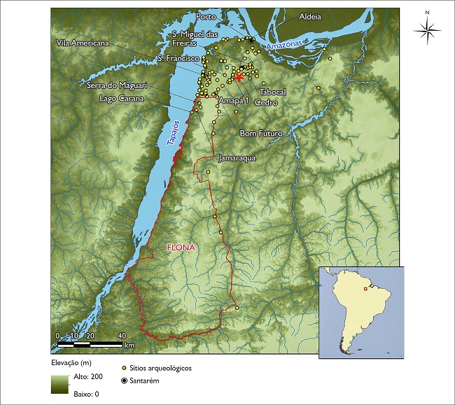 Projetos de pesquisa mais recentes (2006-2014) conduziram prospecções sistemáticas, abrangendo a totalidade da área escolhida, e não sistemáticas, abrangendo somente uma parte seletiva, em uma área de 12.000 hectares, na foz do rio Tapajós e no platô de Belterra – incluindo sítios na Floresta Nacional (FLONA) do Tapajós –, e identificaram 148 sítios arqueológicos pertencentes à cultura Santarém ( Alves, 2014; Figueiredo, 2019; Gomes et al., 2018; Schaan, 2016; Stenborg et al., 2012). O aspecto interdisciplinar, os objetivos e as metodologias desses projetos, alinhados com os conceitos promovidos pelo paradigma histórico-ecológico, ampliaram a abordagem do registro arqueológico na região, permitindo o estudo das relações entre as sociedades e o meio ambiente nessa área ( Levis et al., 2017; Maezumi et al., 2018a, 2018b; Stenborg, 2016). Dos 148 sítios identificados na região, 68 estão localizados no platô de Belterra. Esses sítios compartilham, além da cerâmica da cultura Santarém, estruturas de terra (poços, montículos, caminhos antigos), solos de terra preta e bolsões, considerados lixeiras rituais e fazem parte da cultura Santarém (Araujo da Silva, 2015, 2016; Gomes, 2012). Contudo, baseado no estado de preservação dos sítios, foram escavados sete sítios no platô de Belterra ( Figura 1), incluindo o sítio Cedro.