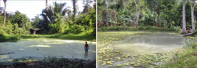 Enquanto os dados sobre cultura material, geoquímica e arquebotânica apresentados neste trabalho provêm das escavações do sítio Cedro, as reflexões sobre a possível continuidade, no presente, de práticas sociais passadas são baseadas em dados das prospecções dos 68 sítios localizados no platô de Belterra, os quais são caracterizados pela presença de terra preta, sendo que 35 possuem poços naturais e artificiais utilizados para armazenar as águas de chuvas em uma área afastada dos rios principais ( Stenborg, 2016; Figueiredo, 2019). Durante as prospecções dos sítios, foi observado que moradores da área de Belterra continuam utilizando a terra preta para o cultivo das suas hortas e se aproveitam dos poços indígenas, que ainda retêm água para criar peixes e até introduzir outros animais aquáticos, como jacarés e tracajás. Baseando-se em outros estudos, sabemos que a manutenção de poços potencialmente contribui com o aumento da biodiversidade ( Pino et al., 2006). Assim, a observação, no presente, de práticas sociais passadas permite refletir tanto sobre a função dos solos e das estruturas dos sítios no platô de Belterra quanto sobre práticas de manejo sustentáveis no presente ( Figura 2).