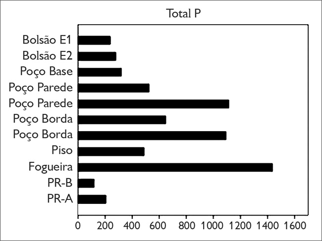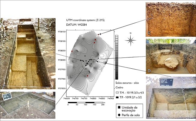 O sítio Cedro apresenta antrossolo (terra preta: 10YR 3/1 a 4/3) sobre latossolo amarelo distrófico (10YR 6/8). O perfil de referência apresentou latossolo amarelo distrófico extremamente ácido (pH 3,8-4,1), abundante em Al 3+, com baixas CTC e saturação por bases (V), assim como acúmulo limitado de matéria orgânica, de nutrientes (Ca, Mg, Mn, Zn e K), de elementos (C, N e P totais) e de razão C-N (11,1-12). Ou seja, um solo pouco fértil e não estável. Nos contextos aqui analisados, a camada de latossolo apresentou teores de fósforo (total e disponível) mais altos do que no perfil de referência. Essa alteração na concentração de fósforo corrobora a influência antrópica no sítio Cedro, haja vista que este elemento apresenta grande mobilidade vertical por lixiviação e por processos pedogênicos ( Kampf et al., 2003; Kern, 2009). Adicionalmente, o acúmulo de fósforo no latossolo variou de acordo com cada área de atividade ( Figura 4).
