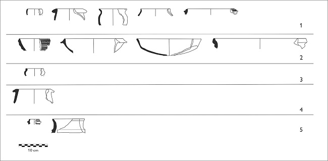 A análise da cultura material foi conduzida no Laboratório de Arqueologia da Universidade Federal do Pará (UFPA). Enquanto as indústrias líticas foram analisadas por Tallyta Suenny Araújo da Silva, a primeira autora deste artigo conduziu as análises cerâmicas. Foram analisados 1.424 fragmentos diagnósticos, dos 7.954 fragmentos de cerâmica coletados nas prospecções e escavações efetuadas no sítio Cedro. Esses fragmentos incluem bordas, bases, flanges, alças, apêndices modelados, estatuetas e todas as peças decoradas. Selecionamos as bordas, as bases e os flanges para estimar o número mínimo de vasilhas (NMV) e reconstituímos a circunferência original das vasilhas com a ajuda de um ábaco. Todas as vasilhas foram desenhadas por meio do programa CorelDraw X7, com fim de facilitar a classificação delas em categorias funcionais. O tempero dos fragmentos foi observado através de uma lupa binocular (4X), e a cor dos fragmentos foi determinada com base no Munsell Soil Color Book ( Munsell, 2009). A espessura dos fragmentos foi medida com um paquímetro um pouco abaixo do lábio. O tipo de queima foi descrito com base no trabalho de Rye (1976). Todos os tratamentos de superfície e de decorações foram registrados. Além das vasilhas, também foi analisada a cerâmica associada à produção e ao uso desses recipientes, como as bolotas de argila e as trempes. Enfim, a literatura especializada ( Rice, 1987; Rye, 1976; Shepard, 1985; Schiffer et al., 1994) permitiu classificar as vasilhas em três tipos funcionais de vasilhas: (1) para cozinhar, (2) para servir e (3) para armazenar líquidos.